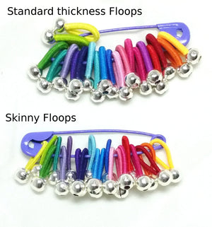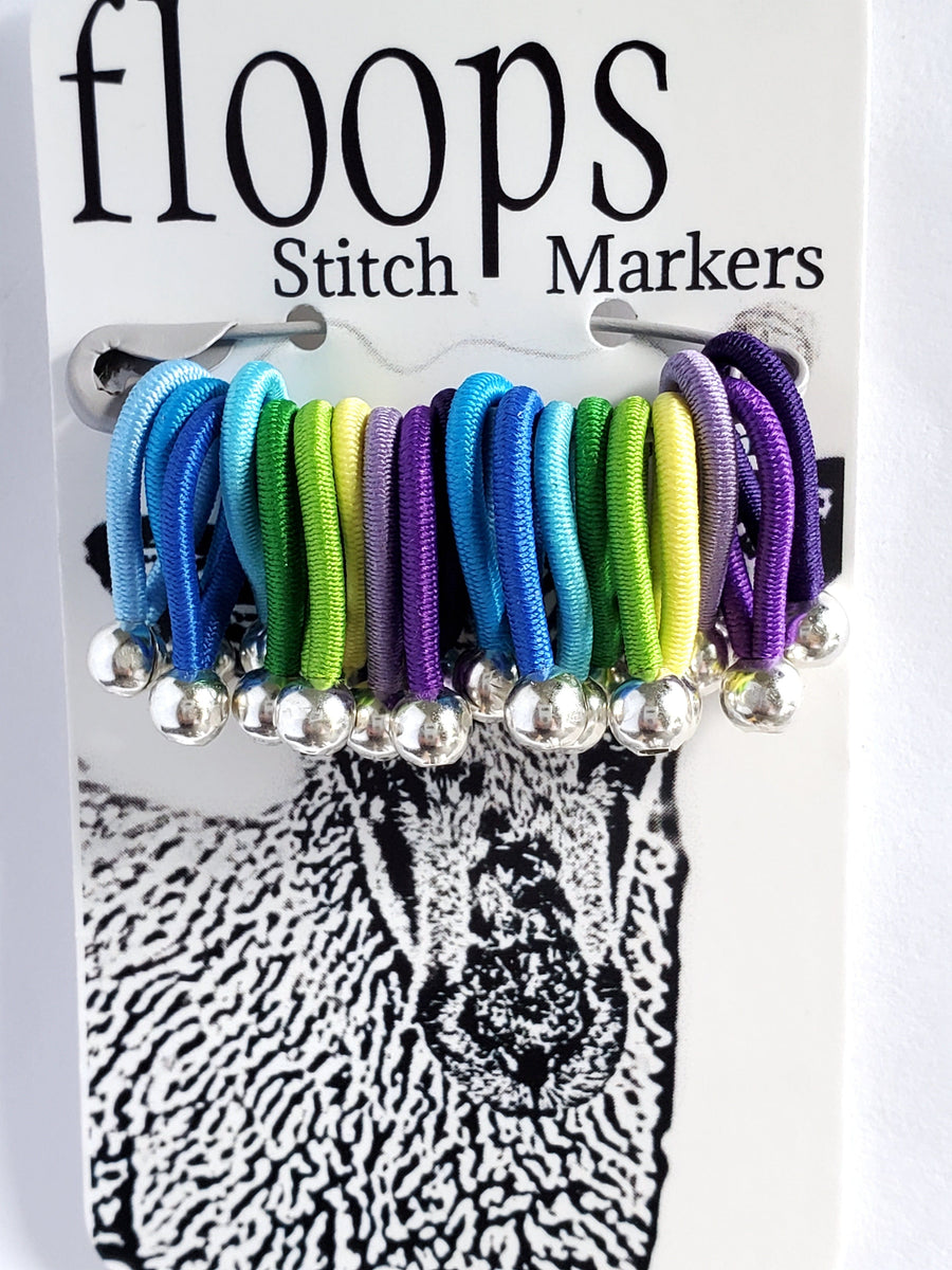 These one of a kind elastic Floops stitch markers slide over your knitting needle like an additional stitch and don't bother you while knitting. Each set contains 20 stitch markers stored on a safety pin.
